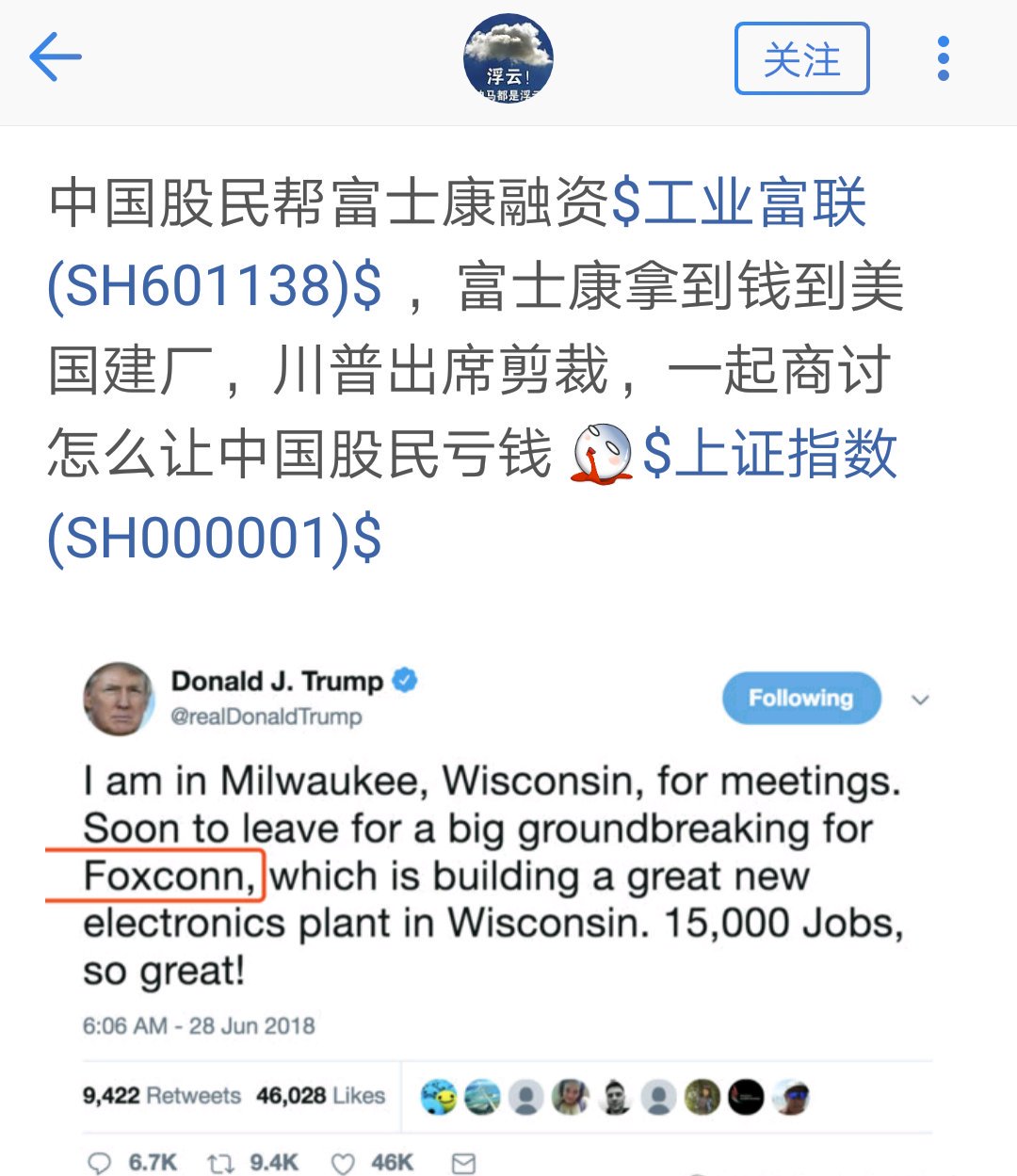 在富士康美国新厂破土仪式上,川普总统说:“这将很棒。我们正在为美国做很棒的贸易协定。将在威斯康辛州投资至少100亿美元。”川普跟郭台铭两人参观工厂后,举行联合记者发布会。川普总统说,富士康设厂只是个开端,美国的克莱斯勒将会把工厂搬回美国,日本的丰田汽车将在阿拉巴马州开工厂,越来越多公司将到美国设厂。 川普总统邀请日本软银集团社长孙正义上台致词;此前孙正义也曾经造访纽约的川普大楼,向川普表达投资美国的意愿。